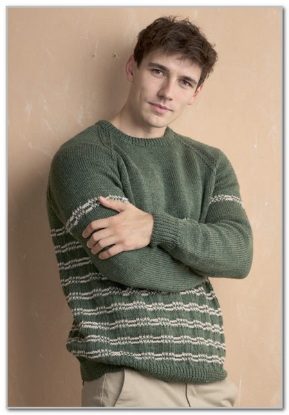 Двухцветный узор из снятых петель придает этому классическому пуловеру с рукавом реглан особую изюминку.
