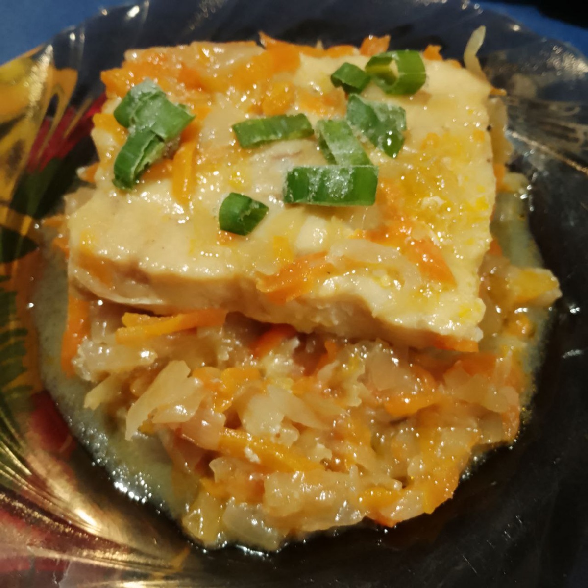Ингредиенты 1 луковица 1 средняя морковь 200гр квашеной капусты 400гр филе минтая Соль Черный молотый перец 150мл воды 1 чайная ложка муки Соль Черный молотый перец Лавровый листик Зелень по желанию Приготовление Очистить и мелко нарезать репчатый лук, морковь натереть на терке, налить в сковороду налить растительное масло, обжарить лук с морковью до мягкости, добавить отжатую квашеную капусту, влить 100мл. воды, накрыть крышкой и тушить на малом огне 20 мин, затем посолить и поперчить филе, выложить его на тушеные овощи, чайную ложку муки развести оставшейся водой и вылить сверху на рыбу, добавить лавровый листик,накрыть крышкой и тушить 10 минут, затем перевернуть кусочки рыбы и снова потушить 5-10 минут. Посыпать зеленью и подавать к столу. Приятного аппетита!