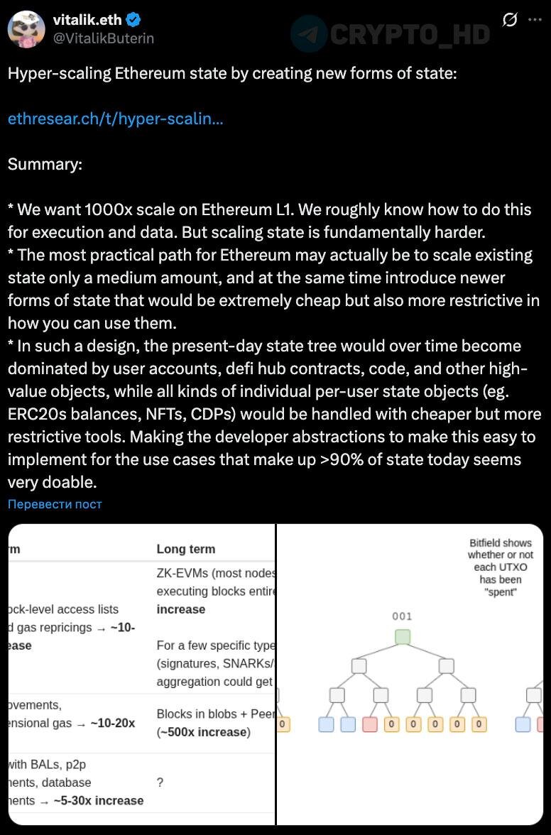 Ethereum можно масштабировать в 1000 раз, проблема не в транзакциях, а в state – данных, которые сеть хранит постоянно. Предложение: ➥ Разделить хранилище на два типа – как на телефоне, где есть быстрая память и облако. ➥ Дорогое хранилище (как сейчас): для важных вещей – аккаунт, основные DeFi-контракты, код приложений. Гибкое, но дорогое. ➥ Дешевое хранилище (новое): для массовых данных – балансы кошельков, NFT, позиции в кредитных протоколах. Намного дешевле, но с ограничениями – нельзя делать все что угодно. ➥ Так сеть сможет обработать в 1000 раз больше информации, потому что 90% данных будут храниться дешево. Виталик считает, что для большинства случаев (токены, NFT) создать удобные инструменты – реально. Ранее: - продажа ETH - деньги на благотворительность - прокомментировал дискуссию - пост о L2 - ответы топов криптоиндустрии Crypto Headlines