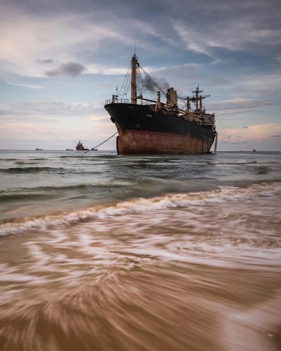 ○ Ситуация усугубилась местоположением судна на мели. Правый борт, обращённый к открытому морю, принял на себя всю мощь прибоя, что привело к пролому корпуса. Через пробоину вода хлынула в грузовые трюмы и машинное отделение, полностью выводя судно из строя.