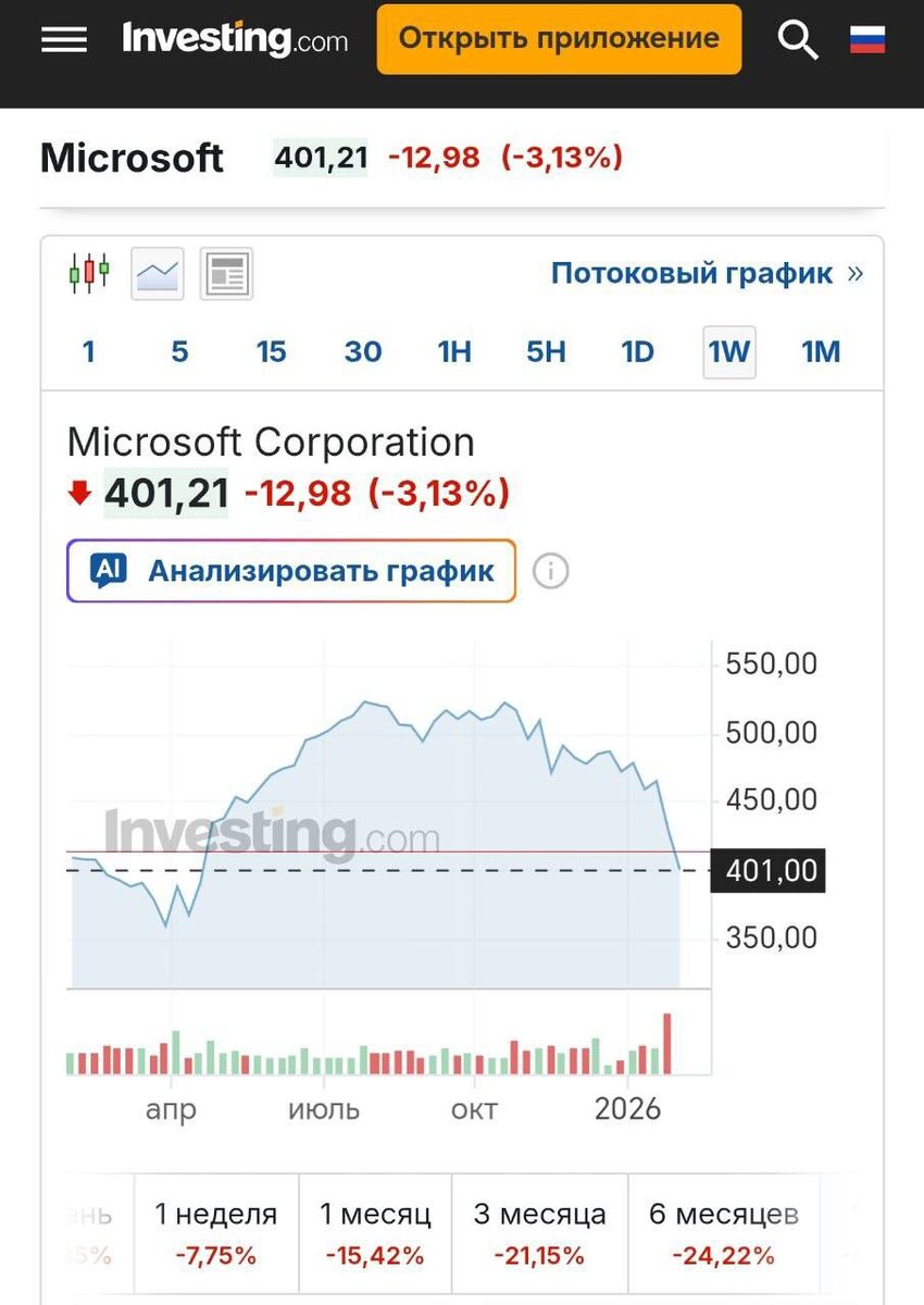 На фоне растущего недовольства пользователей навязыванием ИИ-функций и Windows 11 бумаги Microsoft продолжают снижаться. В числе претензий — рост потребления ресурсов, ухудшение стабильности и качества ОС от версии к версии, а также общее ощущение «AI-слопа» вместо реальных улучшений. Инвесторы всё внимательнее смотрят на реакцию аудитории — и она Microsoft сейчас явно не в плюс. 💬 @Mikhaylov_Review
