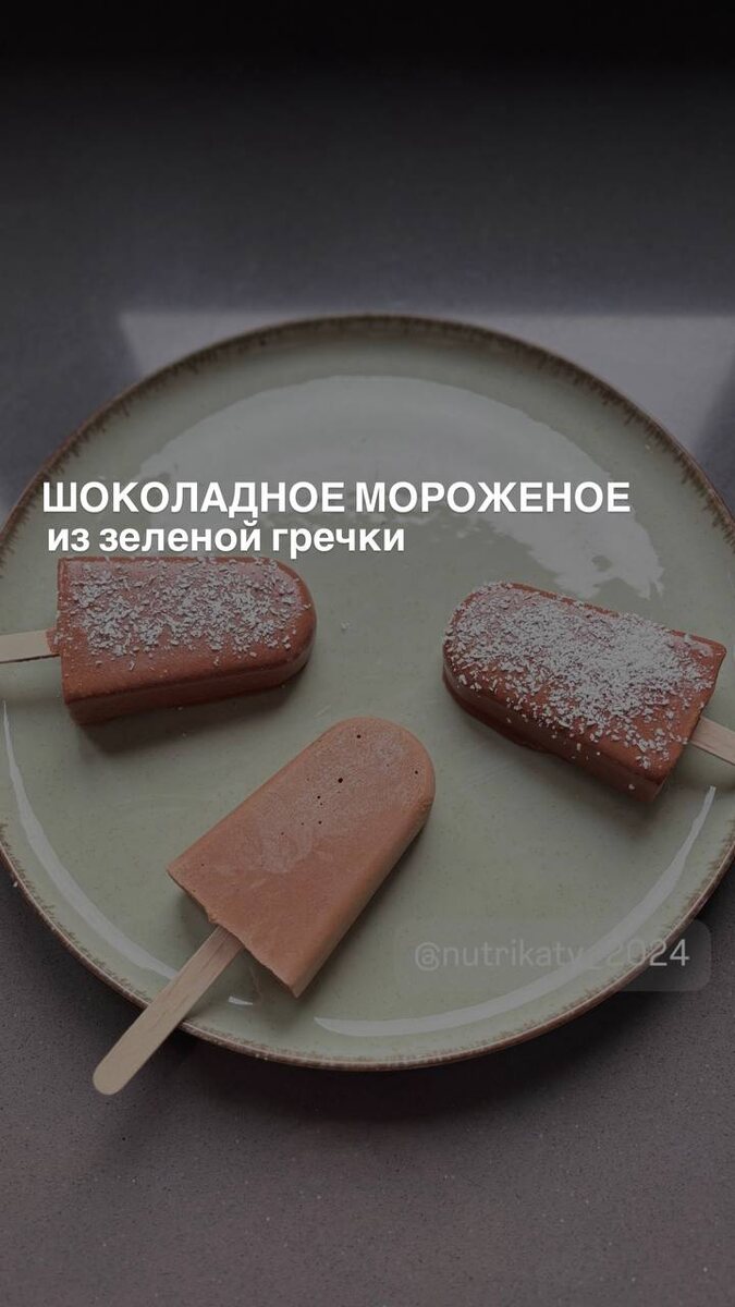 Для мороженого: ∙ Зеленая гречка (замоченная) 200 г ∙ Банан 90 г ∙ Кешью 70 г ∙ Какао 15 г (можно заменить на сублимированную малину для варианта с кислинкой) ∙ Кокосовое молоко 100 мл ∙ Протеин 2 мерные ложки Для глазури (на выбор): Вариант 1: ∙ Кокосовое молоко жирное ∙ Какао (или сублимированная малина) ∙ Стевия Вариант 2: ∙ Шоколад 75% Для украшения: ∙ Кокосовая стружка, орехи, ягоды Приготовление 1. Промойте зеленую гречку и замочите на ночь в воде. 2. Тщательно промойте крупу и дайте стечь влаге. 3. Соедините гречку со всеми остальными ингредиентами и взбейте в блендере до однородного состояния. 4. Переложите массу в формочки для мороженого и отправьте в морозильник до полного застывания. 5. После замораживания покройте мороженое растопленным и слегка охлажденным шоколадом или приготовьте глазурь из кокосового молока: разогрейте молоко, добавьте какао (или измельченную малину) и стевию по вкусу, остудите. 6. Посыпьте кокосовой стружкой, орехами или ягодами
