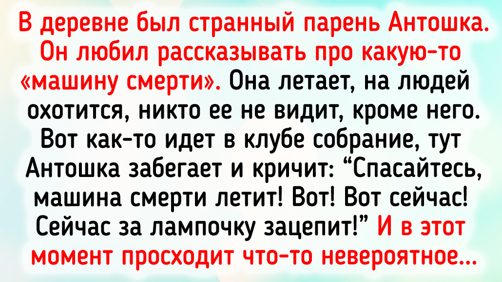 В деревне был странный парень Антошка. Он любил рассказывать про какую-то «машину смерти». Она летает, на людей охотится, никто ее не видит, кроме него. Вот как-то идет в клубе собрание, тут Антошка забегает и кричит: — Спасайтесь, машина смерти летит! Вот! Вот! Сейчас за лампочку зацепит! И в этот момент просходит что-то невероятное: лампочка вспыхнула и взорвалась. В зале — тихая паника… © Дикий Кот / Dzen Остановились с мужем в Австрии в отеле, а там хозяйка оказалась русская женщина, которая уже лет 20 как уехала из России. Мы поздно приехали в отель, были голодные, и она что-то нам нашла пожевать, угостила самодельной настойкой. Мы долго болтали, но что-то мне не давало покоя, а потом я поняла, что она «гыкает». А именно такой говор у моей родни в Липецкой области. Ну, я поинтересовалась — оказалось, и правда оттуда. Так еще и из той же деревни, что мои бабушка с дедушкой. Ну тут вообще понеслось: вспомнили всех жителей деревни, поплакали, посмеялись. Муж был в шоке. © Жужа Лаптев
