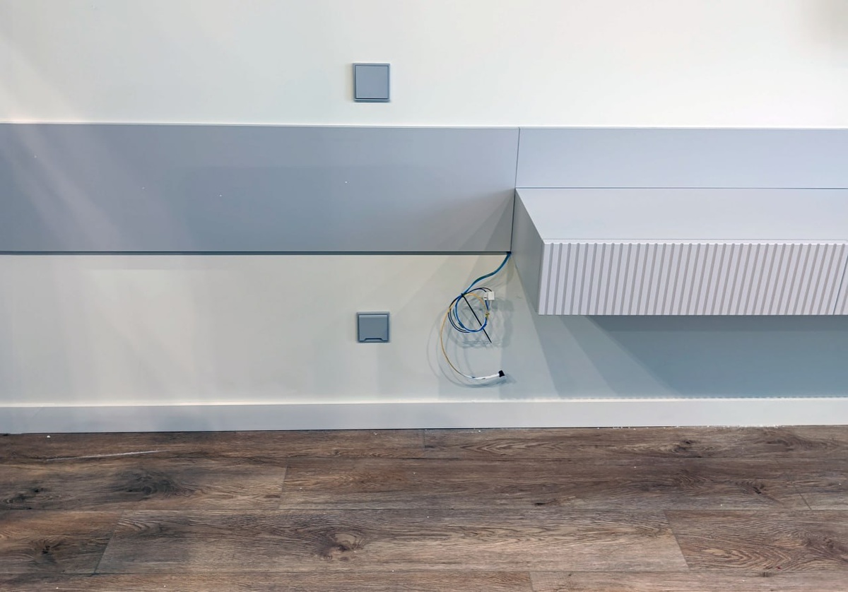 Ни подсветка, ни что-либо еще для её реализации изготовителем, ска, тумбы с подсветкой, конечно же не предусмотрено. Ни сделано, не подключено вообще никак. Где вы, нормальные адекватные мебельщики? Одни ведь гробовщики кругом! Зачем, скажите, браться за изготовление тумбы с подсветкой, делать её без подсветки, не в размер, и оставлять заказчика решать увлекательные задачи? Какое итоговое, готовое изделие? Кто его должен доделывать? Геи-негры из дальнего космоса? Мы заказчику, разумеется, поможем. Тем же, кто только затевает ремонт, хочется посоветовать более ответственно заключать с мебельщиками договора. Ну, и оцените прекрасный момент фотографии - точность нашей разметки. Так-то под провод должно было быть выфрезеровано углубление с обратной стороны этой деревосодержащей конструкции и уже оттуда раздаваться питание на светодиодную ленту, чего гробовщики конечно же делать не стали, не смогли, не захотели и даже не думали. Это же не их проблема, а заказчика. #elekt_riki