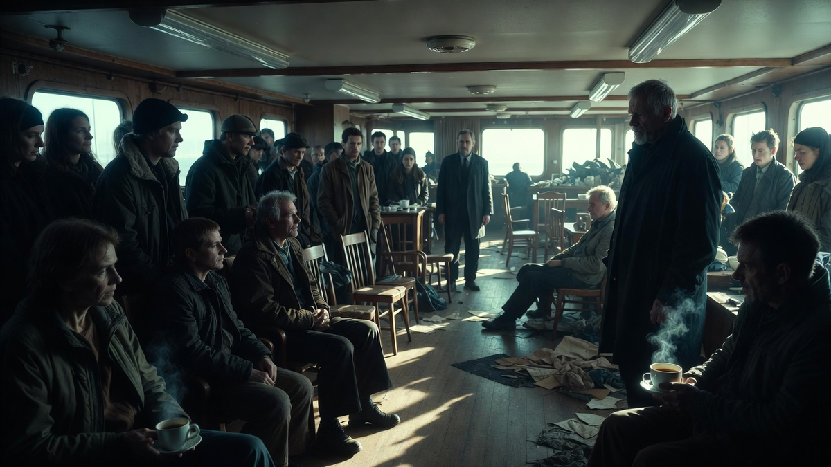 Серое, водянистое утро застало «Аквилегию» неподвижно качающейся на ослабевшей, но всё ещё высокой зыби. Шторм отступил, оставив после себя низкое, разорванное в клочья облаками небо и море цвета свинца. Ветер теперь был лишь холодным, пронизывающим сквозняком, гуляющим по опустевшим палубам. Но главное — тишина. Относительная тишина, нарушаемая лишь плеском волн и привычным гулом работающего на холостых генератора. Завывания и рёва больше не было. Это было первым слабым, но ощутимым признаком того, что кошмарная ночь кончилась, и началось что-то новое, возможно, не менее опасное, но иное. Пассажиры начали выползать из своих кают, похожие на призраков. Лица были землистыми, под глазами — тёмные круги, движения — замедленными и осторожными. Они собирались в салоне, не глядя друг на друга, как заключённые после пытки. Даже Глеб, обычно такой собранный, был небрит и помят. Максим выглядел совершенно разбитым, его ярость выгорела, оставив лишь пустоту и глубокие морщины вокруг глаз. Софья