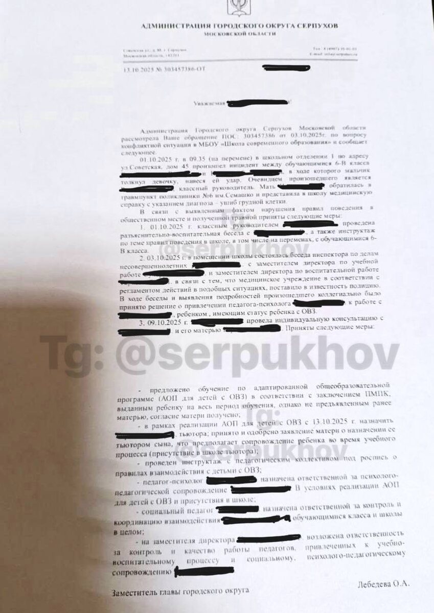 ❗‼️❕ По ситуации в школе № 1 История, связанная с инцидентом в первой школе, действительно серьёзная. С редакцией на связи как родители, так и администрация города. У сторон разные версии происходящего, свои аргументы и требования. Мы публикуем официальный ответ администрации на обращение матери пострадавшей, который мы получили от родителей девочки. В нём не отрицаются ранее озвученные мнения и подтверждается, что по ситуации проводилась работа с привлечением профильных специалистов. Наша принципиальная позиция — дать возможность высказаться всем сторонам. Сейчас мы продолжаем изучать документы и аргументацию участников этой истории. Редакция остаётся открытой площадкой для диалога, но при этом мы не подменяем собой следственные или судебные органы и не даём юридических оценок. Наша задача зафиксировать проблему и показать, что она существует. И этого не отрицает ни одна из сторон. Поскольку речь идёт о несовершеннолетних, комментарии под публикацией временно запрещены, до тех п