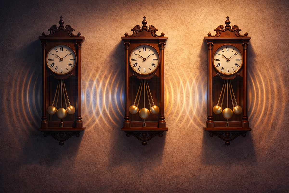 Будто они подстраиваются друг под друга — хотя никто их не настраивал специально. Это не совпадение и не мистика. Каждые маятниковые часы при движении передают микроколебания стене.