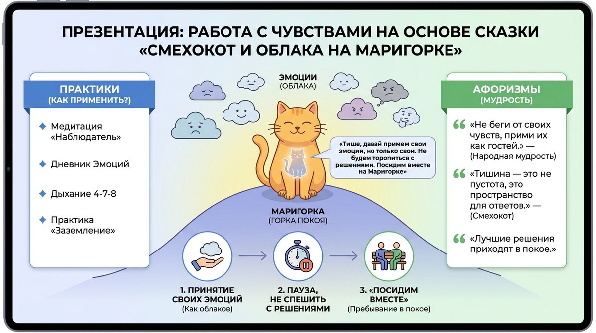 (Я не забыла про Ницше). Это не просто истории. Это — тихие пути внутрь себя. Каждая сказка — как лёгкий вдох. Ты не читаешь её разумом. Ты проживаешь её телом. Просто повторяй за Смехокотом: — садись, как он… — дыши, как он… — гладь хвост, как он… — слушай тишину, как он… Он не «исправляет» себя. И в этом — вся магия. Когда ты с ним — ты не решаешь, не анализируешь, не борешься. Ты просто присутствуешь. И тело начинает дышать глубже. Сердце — мягче. Душа — легче. Ты получаешь: ✅ Тишину, которую давно забыл ✅ Ощущение безопасности, как будто кто-то обнял тебя, не говоря ни слова ✅ Связь с собой — не через слова, а через тепло, дрожь, лёгкость, тяжесть… ✅ Доверие: ты понимаешь — ты не один. Даже в тишине. Смехокот — не герой. Он — твой тихий друг, который уже сидит рядом. Сказка про Смехокота и облака на Маригорке Однажды кот внутри Смехокота сказал себе тихо: — Тише, давай примем свои эмоции, но только свои. Не будем торопиться с решениями. Посидим вместе н