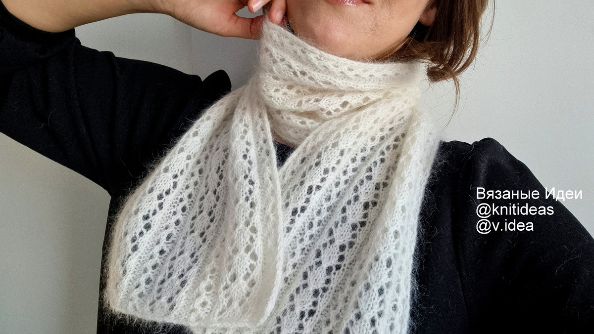 Рада приветствовать вас на канале Вязаные Идеи! Я связала ажурный шарфик из остатков пряжи и хочу поделиться с вами схемой вязания. Шарф связан в 2 нити: 1 нить пух норки и 1 нить мохера на шелке. Шарф получился очень красивый, мягкий, пушистый и теплый, несмотря на ажурность. Внимание! При копировании и публикации моих материалов на других ресурсах указывайте активную ссылку на источник: канал Вязаные Идеи Длина шарфа 142 см, ширина - 19 см. Вес - 82 гр. Для вязания потребуется: Раппорт узора 13 петель Количество петель кратно 13 +6 п (для симметрии узора) + 2 кромочных. Соединить 1 нить мохера и нить пуха норки, набрать 47 петель на спицы №3,5, провязать один ряд изнаночными петлями, далее вязать узором по схеме: Узор состоит из 2- х частей: 1-я часть из 6 петель - раппорт 2 ряда в высоту 2-я часть из 7 петель - раппорт 6 рядов в высоту Текстовое описание узора: 1 ряд: кром, *2 изн, 2 вм. лиц. вправо, накид, 2 изн, 2 вм. лиц. вправо, накид, 3 лиц, накид, 2 вм. лиц. влево*, кр