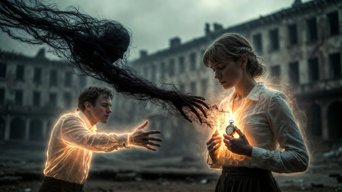 Слова Архитектора о «переформатировании контекста» повисли в воздухе не абстракцией, а конкретной, немедленной угрозой. Его внимание, эта леденящая тяжесть, сместилось с меня на Алису. Один из клочьев тьмы, составлявших его форму, отделился и вытянулся в сторону, как щупальце или рука, сотканная из самой концепции забвения. Он двигался медленно, неотвратимо, не нарушая тишины, но от его движения застывший воздух посёлка завихрился, и бледные «Отпечатки» вокруг замерцали, словно испытывая вторичную боль. Алиса застыла, её глаза были широко раскрыты, но в них не было паники. Была ясность. Её рука сжала часы-оберег так сильно, что костяшки пальцев побелели. Я почувствовал, как от неё исходит волна тепла — не физического, а того самого, что мы вложили в часы. Она не отступала. И в этот момент во мне что-то перещелкнуло. Инстинкт кричал: «Атакуй! Бей его своим «шумом», как Собирателя!». Но холодный, только что полученный урок диалога говорил другое: прямая конфронтация с ним бессмысленна. О