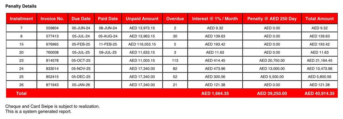 Приятель обратился с просьбой провести переговоры, чтобы сбить сумму штрафов за просрочку по его квартире в Дубае. Там все просто, платежи ежемесячно, а за опоздание полагается штраф в 250 дирхам плюс пеня. Но вот подвох, когда просрочка переваливает за месяц, этот ежедневный штраф начинает тикать заново на сумму следующего платежа. В третий месяц история повторяется. Получается, каждый новый месяц плодит отдельный штрафной счет, и они все накапливаются, как снежный ком в пустыне. В итоге набежало 40 тысяч дирхам вместе с пеней, что в долларах выходит около 11 тысяч. А сумма самих платежей за эти три месяца ненамного превышает эту цифру. Представьте, заплатить за опоздание почти столько же, сколько за саму услугу. Ирония рынка недвижимости в чистом виде. На практике застройщики иногда закрывают глаза на недельную задержку, не начисляя ничего. Но когда просрочка серьезная, как видим, сумма вырастает до внушительных размеров, способных удивить даже меня🥴 Однажды в похожей ситуации н