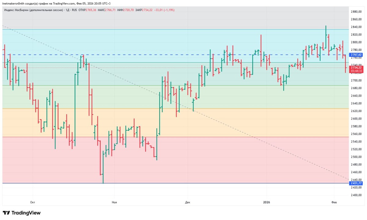 ❗️5 февраля российский фондовый рынок снизился, индекс МосБиржи подешевел на 1,41% до уровня 2737,13