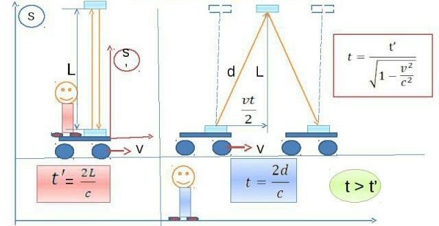 Некоторые могут утверждать, что можно взять время движения вагона, например 1 секунда и время движение луча света от фонарика до зеркала, примерно это и изображено на рисунке, но здесь есть одна тонкость. Луч света перемещается от фонарика до зеркала и обратно. Это есть один цикл работы часов. Какое расстояние пройдёт луч света за цикл? Если L= 2 метра, то очевидно 4 метра. А сколько таких циклов будет за 1 секунду, ведь мы не думаем, что после того, как импульс пройдёт один цикл он остановится и будет ждать пока пройдёт одна секунда. То есть расстояние, которое пройдёт импульс, перемещаясь между фонариком и зеркалом в течении одной секунды будет ну очень большим и не сравнимым с расстоянием пройденным системой за одну секунду. Кроме того, в таком случае, мы не можем изобразить треугольник в том виде, в каком он изображён на рисунке.так как расстояние пройденное импульсом между фонариком и зеркалом за 1 секунду , будет намного больше расстояние между фонариком и зеркалом в световых часах. То есть мы имеем N треугольников. Получается, что в качестве горизонтального катета мы берём расстояние пройденное системой за 1 секунду, а в качестве вертикального расстояние пройденное импульсом между фонариком и зеркалом ну за очень малое время( кому интересно можете посчитать). Извините, но данные катеты не могут принадлежать одному треугольнику. Исходя из выше написанного, никакого движения импульса по диагонали нет и быть не может. Это игра воображения. А замедление времени, если исходить из "замечательного" треугольника Эйнштена, ну очень маленькое, даже при скорости системы близкой к световой. И ещё: