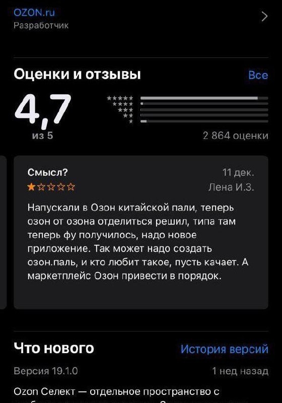 Пока Ozon делает отдельное премиальное приложение Ozon Select, покупатели в отзывах предлагают ровно обратное решение. Не выносить «премиум» в отдельное приложение, а вынести туда всё остальное. Цитата из стора: «Напускали в Ozon китайской пали — теперь решили отделиться. Может, лучше создать Ozon.паль, а нормальный Ozon привести в порядок». По сути, пользователь формулирует простой тезис: ✔ базовый Ozon = порядок и доверие, ✔ отдельное приложение = для “дешёвого и сомнительного”, ✔ а не наоборот. Хороший пример того, как реальный пользовательский фидбэк конфликтует с продуктовой стратегией площадки. Иногда рынок видит проблему точнее, чем продуктовые команды. Marketplace_biz - отдай свой буст каналу