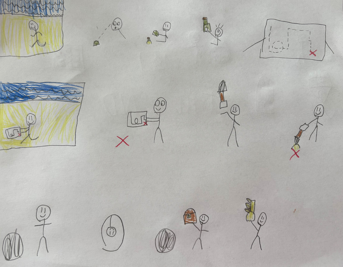 «Я шел по берегу моря, увидел водоросли, убрал их и нашел под ними бутылку. В ней была карта сокровищ. Я последовал направлению указанному на карте и пришел к пункту Х. Взял лопату и начал копать. Выкопал яму и заглянул в нее. Там лежал сундук. Я взял ключ и, когда начал открывать сундук, надеялся, что там будут деньги.