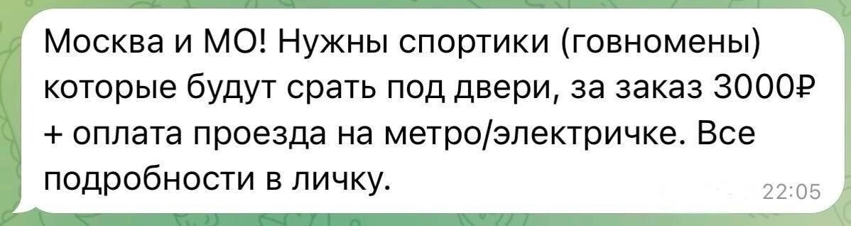 В Москве появилось необычное вакантное место: за 3000 рублей здесь ищут исполнителей для деликатных поручений. Суть работы, если верить описанию, сводится к тому, что надо срать под дверь квартир.