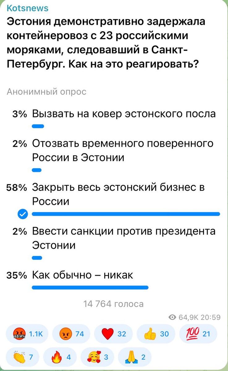 ⚡️⚡️⚡️ 58 процентов подписчиков считают, что надо окончательно перекрыть Эстонии финансовый краник из России