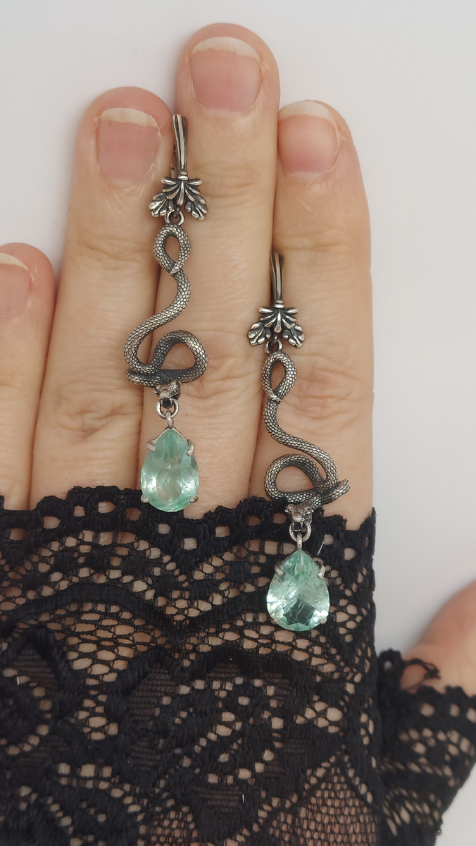 Серьги "Змейки" с малышевскими бериллами весом 8,8 карат. Выполнены из серебра 925°. Глаза инкрустированы 4-мя черными бриллиантиками диаметром 1 мм., кр. 57, общим весом 0,012 карат.