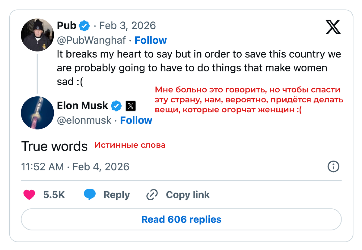 После публикации «файлов Эпштейна» выяснилось, что Маск в 2012–2014 годах обсуждал с ним вечеринки и возможный визит на остров. Маск говорит, что не поехал, но письма показывают, что он активно интересовался встречами. С тех пор как 30 января были опубликованы новые файлы Эпштейна - около 3,5 миллиона страниц - Маск ведёт перепалку в сети с основателем LinkedIn Ридом Хоффманом: каждый обвиняет другого в том, что тот более замешан в этих материалах. «Главное отличие между нами, Рид, в том, что ты поехал, а я — нет. На самом деле ты ездил несколько раз. Первый раз, возможно, был ошибкой, но не второй», - написал Маск Маск параллельно делает странные комментарии в X - например, поддержал пост о «вещах, которые расстроят женщин». Перевод фрагмента писем между Илоном Маском и Джеффри Эпштейном из 2012 года: 🟩 Эпштейн: «Можешь остаться или просто приехать на день, места полно. Я пришлю вертолёт, чтобы забрать тебя.» 🟢 Маск: «У тебя есть какие‑нибудь вечеринки? Я работал на грани безумия