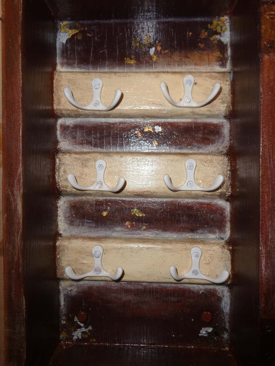 Лежали на чердаке часы давно нерабочие, а короб от них красивый жалко выбросить. Но они лежали не зря по тому, что до них добрались мои руки, долго они крутились в руке и так и этак, но все же решилось, будут ключницей. И началось… Первым делом выбросились все сломленные механизмы, и снялся с дерева лак. Но с ним возникла сложность. Советский лак крепче кирпича, но трем и трем в конце перетрем с помощью шлифовальной машинки и наждаки. Вторым делом красим все дерево, оставляя стекло (заклеим скотчем). В коричневый цвет. Далее внутри где крепился механизм, вырезаем 3 деревянные планки 1на 3 см, крепим с обратной стороны и красим в бежевый цвет. В четвертых. Крепим на планки 6 крючков и добавляем декор золотым на бежевых планках. Делаем бежевые штрихи на коричневом цвете, и кое-где клеем хлопья патины 3 оттенков (золотой, серебряной и бронзовый). Настало время стекол – малое стекло - делаем декупаж пейзажа, а на края крепим лаком акриловым хлопья патины, а второе стекло рисуем акриловым