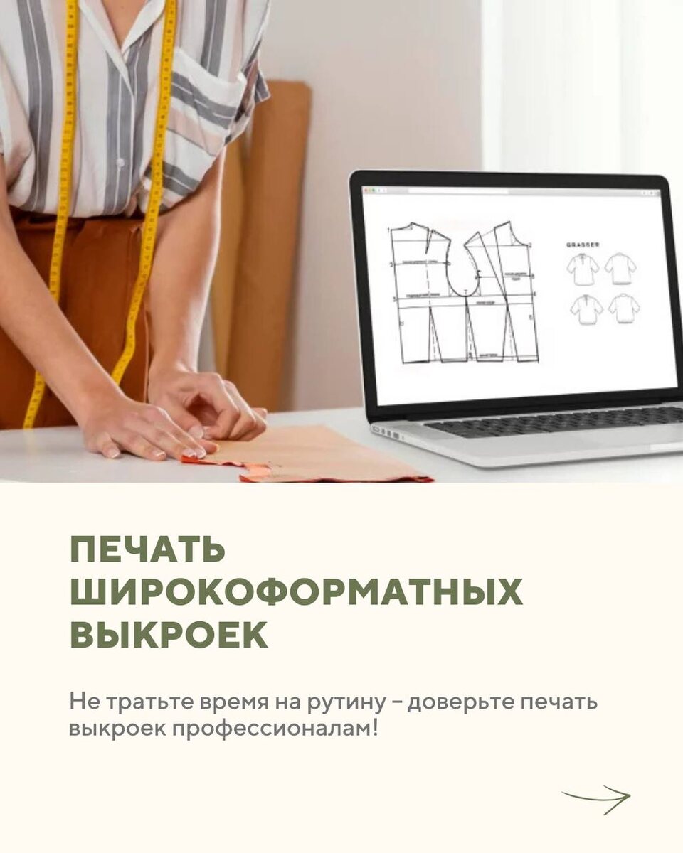 ✂️ Мы хотим освободить вас от рутинной работы и предлагаем экспресс-печать в формате для плоттера! Наши специалисты распечатают вашу выкройку на широкоформатном плоттере, тем самым сэкономив ваше время в 2 раза! Оставить заявку