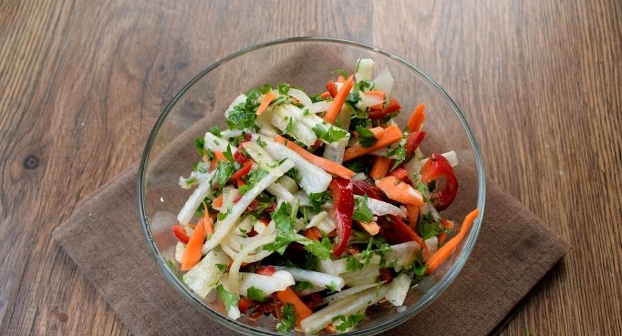 На 500 г редьки болгарского перца — 125 г, моркови — 75 г, репчатого лука — 50 г, чеснока — 75 г, джусая — 50 г, заправки для салата — 75 г, зелени — 25 г, соли, специй — по вкусу.