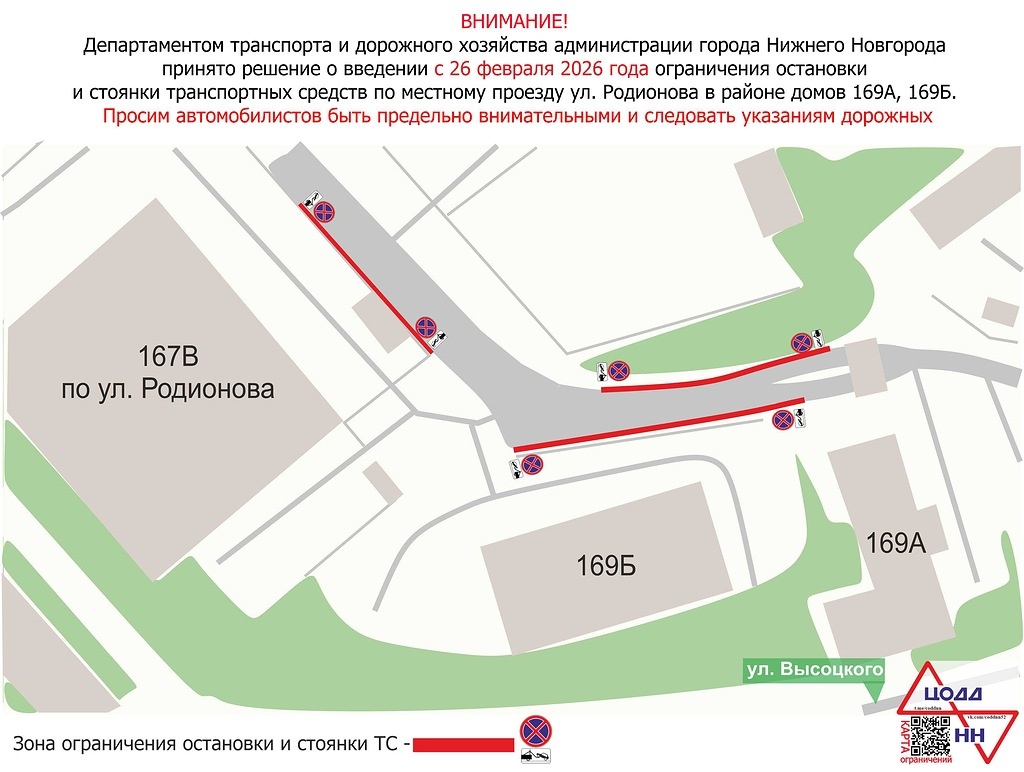 В Нижнем Новгороде с 26 февраля вводятся ограничения на остановку и стоянку транспорта на местном проезде улицы Родионова. Изменения коснутся участка в районе домов № 169А и № 169Б. Как сообщили в городской администрации, корректировка схемы движения необходима для обеспечения беспрепятственного проезда транспортных средств на данном участке улицы Родионова. Водителей просят заранее убрать автомобили за пределы зоны действия ограничений. Транспортные средства, оставленные с нарушением требований, будут перемещены в принудительном порядке. Уточнить информацию о местонахождении эвакуированных автомобилей можно по телефону справочной службы 417-17-07. Специалисты рекомендуют автомобилистам заранее ознакомиться с новыми условиями парковки, обращать внимание на установленные дорожные знаки и соблюдать требования временной организации движения. Напомним, что Нижегородский аэропорт стал лауреатом премии «Воздушные ворота России»