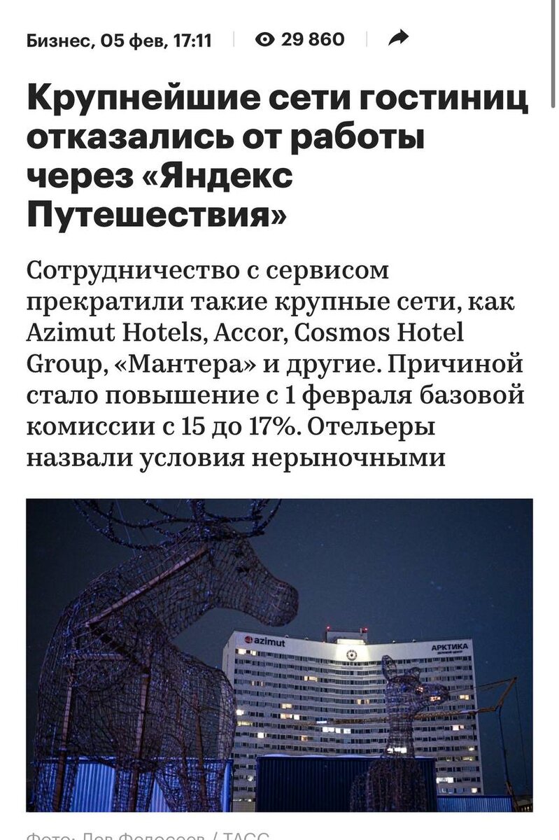 ⚡Крупняки сетей гостиниц отключились от Яндекса после поднятия комиссии с 15% до 17%.