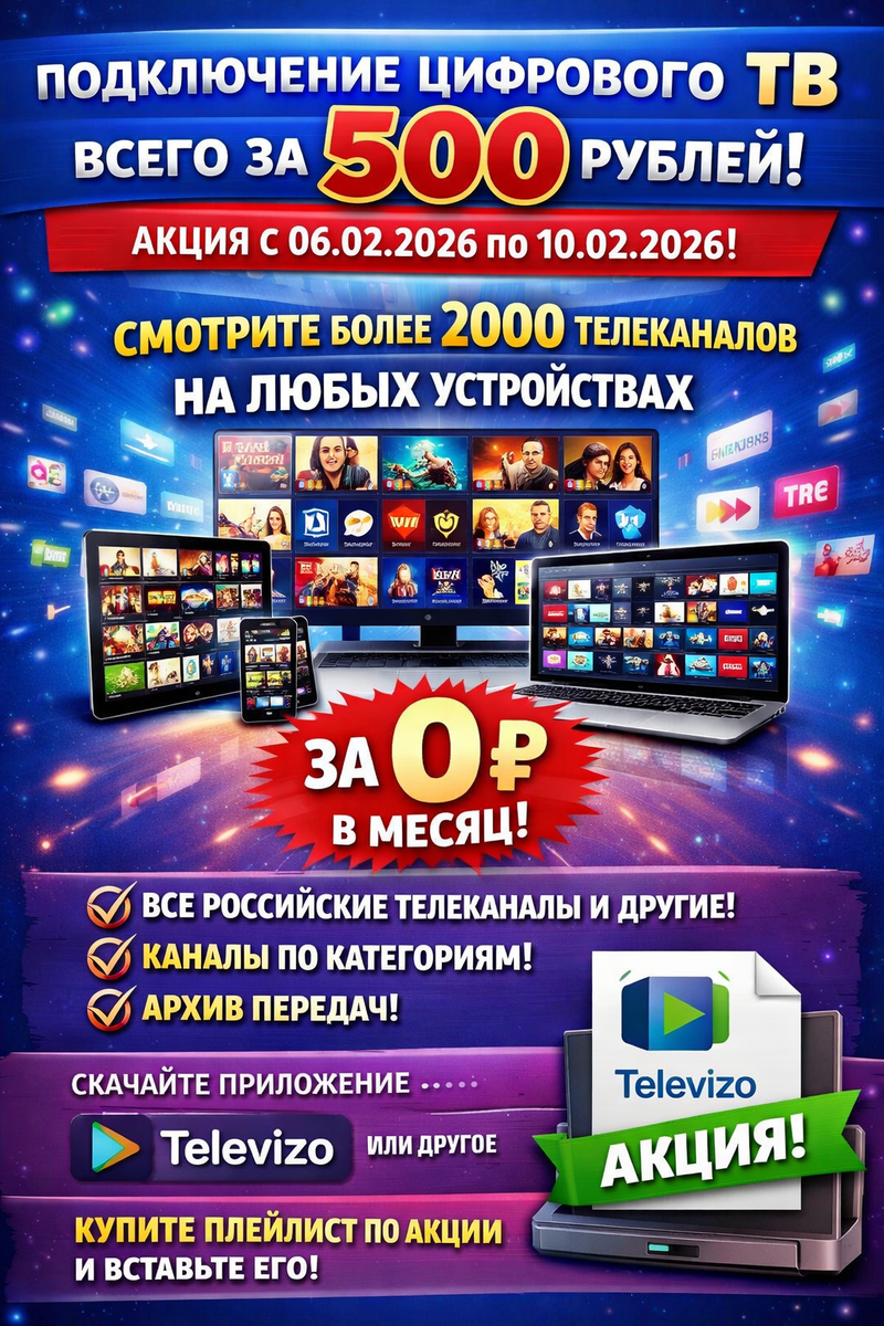 Друзья, представьте: бесконечный поток развлечений, новостей и знаний прямо у вас в кармане или на большом экране! Мы рады объявить о супер-акции, которая перевернет ваше представление о телевидении. С 6 февраля 2026 года по 10 февраля 2026 года вы можете подключиться к цифровому ТВ всего за 500 рублей. И это не шутка – после этого наслаждайтесь просмотром более 2000 телеканалов абсолютно бесплатно, без ежемесячных платежей! Что делает эту акцию по-настоящему уникальной? Во-первых, огромный выбор контента: все российские каналы, от федеральных до региональных, плюс международные хиты. Всё удобно разбито по категориям – фильмы, спорт, новости, детские программы, документалистика и многое другое. Не пропустили любимую передачу? Нет проблем! Полный архив передач всегда под рукой, чтобы пересмотреть в удобное время. А гибкость использования просто поражает. Смотрите на любых устройствах: смартфонах, планшетах, Smart TV, компьютерах или даже на старых телевизорах с приставкой. Никаких кабел
