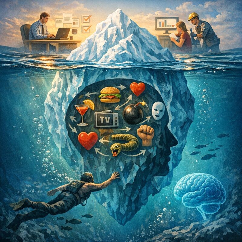 По разным оценкам, лишь 10-20% наших действий являются осознанными. Как правило, это рабочие задачи: подготовить отчёт, собрать аналитику, сделать деталь, написать пост. Во всех остальных случаях мы действуем на автопилоте. Главный критерий — «хочу» или «не хочу». Что съесть из доступного? Просто: это хочу, а это нет. То же самое и с нашими реакциями на происходящее — они почти всегда неосознанные и рождаются в подсознании. Сначала возникает эмоциональная реакция, и лишь затем мы действуем под её влиянием. А если спросить: «Почему ты так сделал?» — мы начинаем вполне логично объяснять свой поступок. Этот процесс называется рационализацией. Всё дело в том, что наш мозг очень ленив. В состоянии покоя он потребляет около 20% ресурсов организма, а при активном мышлении — до 25%. Этот маленький орган весом всего 1,4 кг может забирать четверть всей энергии! Естественно, что думать — по-настоящему думать — мы не любим. Отсюда и берутся привычные шаблоны поведения, призванные экономить силы. Н