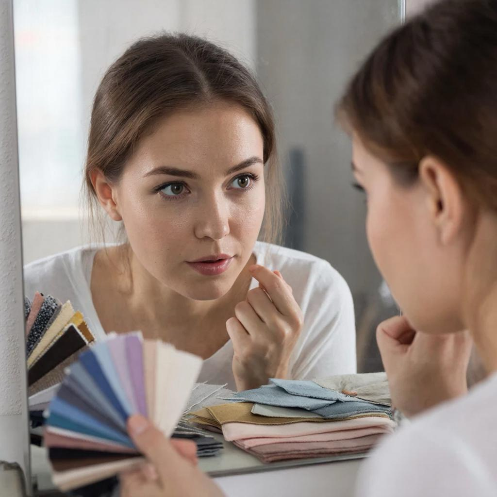 - Экспериментируйте с аксессуарами. Купите два недорогих шарфика — один в тёплой гамме (горчичный), один в холодной (фуксия). По очереди повяжите их у лица при дневном свете. Какой оттенок «стирает» ваши черты, а какой — подчеркивает?