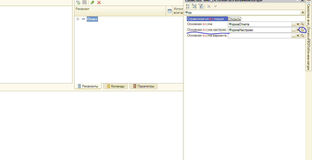 1. По отчету ПКМ > Свойства > Устанавливаем форму настроек (Основная форма настроек). На этом можно закончить. Ошибки больше не будет, но можно расширить состав настроек в СКД. Для каждого варианта отчета(если их несколько):