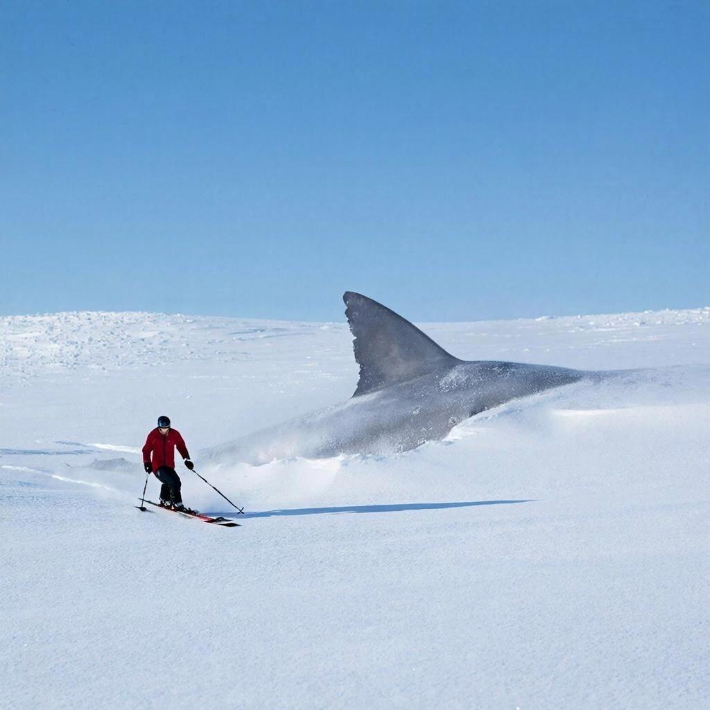 Русская зима без снега не имеет права на существование. От этой сирости одно уныние. А это грех. И ладно бы прелюбодеяние или хотя бы чревоугодие. Так нет же. Первая же метель удалась. Замело всю округу. Мужики помыкались с лопатами, да бросили это бесполезное дело. Не выехать. Теперь уж только потепления ждать. Александр проснулся рано и скорее на лыжи. Напарафиненные лыжи легко скользили по насту. На открытом пространстве ветерок приличный. Поэтому Александр держал путь к леску. Конечно, все тропы засыпало, но он везде пройдет. Кружочек вокруг озера сделает, перекусит – и обратно. Тут его внимание привлекла какая-то серая точка, быстро приближавшаяся к нему. Мчится наперерез. Александр набрал скорость и в последний момент перед столкновением резко свернул. Раскидывая комья снега, из сугроба выскочило что-то огромное, зубастое. Еле увернувшись от чудища, Александр бросил взгляд через плечо и увидел, как в снег зарывается большой рыбий хвост. А снаружи торчит акулий плавник. Снежный мо