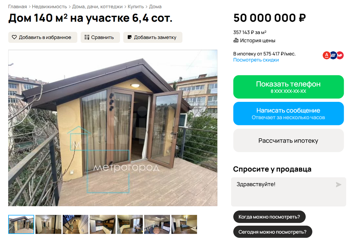 Недавно я готовила материалы для статьи о продаже земельных участков в нашем селе. Эту статью вы можете прочитать по ссылке ниже. На сайте «Авито» много всего есть. И вот в рекламе мне всплыл баннер о продаже дома в Ялте (решили, видать, раз я веду свой канал, то могу себе такое позволить 🤣🤣🤣). Дом — 140 кв. м на участке 6,4 сотки в центре Ялты за 50 млн рублей. В описании, правда, указано, что основной дом всего 100 кв. м, а ещё есть гостевой дом. Спасибо за предложение, но мне такое не подходит: уж больно домик маловат )) А если серьёзно — 50 миллионов за домик и 6 соток? А если сдавать гостевой, то постоянно толкаться на участке с отдыхающими бок о бок. И самим некомфортно — чужие люди у тебя во дворе, и отдыхающим не расслабиться: вечно в каком‑то напряжении при хозяевах. И сколько десятилетий пройдёт, пока ты окупишь такую покупку, если брать чисто под бизнес? В общем, решила я посмотреть, какое самое дорогое предложение на «Авито» по домам в Крыму. И сегодня поделюсь этой инф