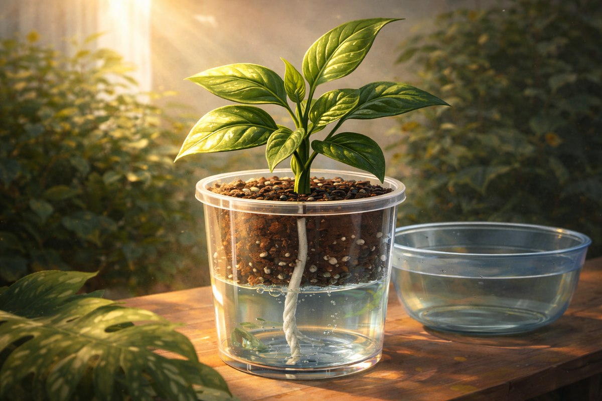 Такой способ делает полив максимально равномерным, не давая пересыхать и переувлажняться корневой системе. Это важно для чувствительных к поливу растений таких как алоказии например, или бегонии. Также это даёт возможность оставлять растения на время и сократить время полива в целом.