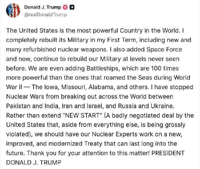 Кроме того, президент США вновь похвастался проектами своих бумажных линкоров и заявил, что вместо почившего ДСНВ необходимо разработать новое соглашение по контролю за ядерными вооружениями. С каждым разом список предотвращенных войн становится все веселее. Военный Осведомитель