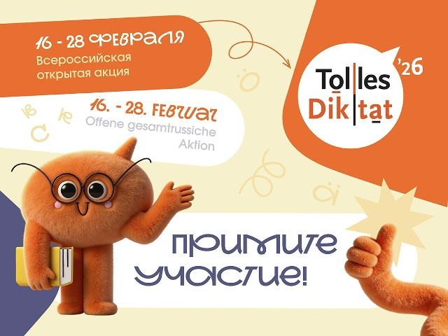 С 16 по 28 февраля в онлайн- и офлайн-форматах в 14-й раз пройдет Всероссийская открытая акция «Tolles Diktat». Написать диктант приглашаются школьники, преподаватели и студенты российских и зарубежных вузов, участники клубов любителей немецкого языка и этнокультурных клубов российских немцев, а также все изучающие немецкий язык и желающие проверить свои знания в кругу единомышленников. Победители и участники акции будут отмечены сертификатами. 20 февраля в 13:00 по московскому времени на официальном сайте «Tolles Diktat» состоится онлайн-трансляция акции. Находясь в любой точке мира, вы можете написать диктант на уровне A2, B1, B2 или C1. Подробная информация и регистрация на участие по ссылке tollesdiktat.rusdeutsch.ru/online . Также в сроки проведения акции вы можете написать диктант на одной из площадок в разных регионах России и за рубежом. Организации, которые хотят присоединиться к акции в качестве площадок, должны пройти регистрацию на сайте tollesdiktat.rusdeutsch.ru/offline н