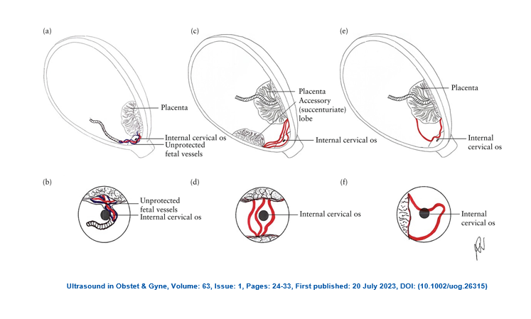 Предлежание сосудов пуповины (ПСП) определяется как наличие незащищенных фетальных сосудов, проходящих через амниотические оболочки над или вблизи шейки матки. Это состояние осложняет примерно 1 из 1200 беременностей. Пренатальное выявление этого состояния имеет большое значение, поскольку эти фетальные сосуды часто повреждаются во время разрыва оболочек, что может привести к внутриутробной или неонатальной смерти от кровопотери. Если предлежание сосудов пуповины не диагностировано пренатально, уровень перинатальной смертности, по сообщениям, превышает 50%. Выжившие новорожденные обычно имеют низкие баллы по шкале Апгар и значительно повышенный риск пожизненных нарушений нейропсихического развития. Однако, если предлежание сосудов пуповины диагностировано пренатально, риск перинатальной смертности снижается. Описаны три типа предлежания сосудов пуповины Факторами риска ПП являются Несмотря на широкую доступность акушерских ультразвуковых исследований ни одно национальное или межд