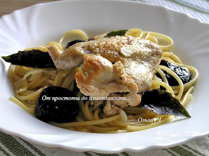 листья базилика для подачи Приготовление: Куски курицы посолите, поперчите, обжарьте со всех сторон на растительном масле, выложите в миску. На том же масле обжарьте нарезанные лук и чеснок до прозрачности, влейте вино, дайте выпариться спирту, всыпьте муку и, постоянно помешивая, доведите до кипения. Верните куски курицы в сковороду, влейте воду, доведите до кипения, тушите около 20 минут. Добавьте чернослив и тушите ещё около 15 минут до готовности. Спагетти отварите до полуготовности, выложить к курице, перемешайте и оставьте на 3-5 минут. Подавайте, украсив лист