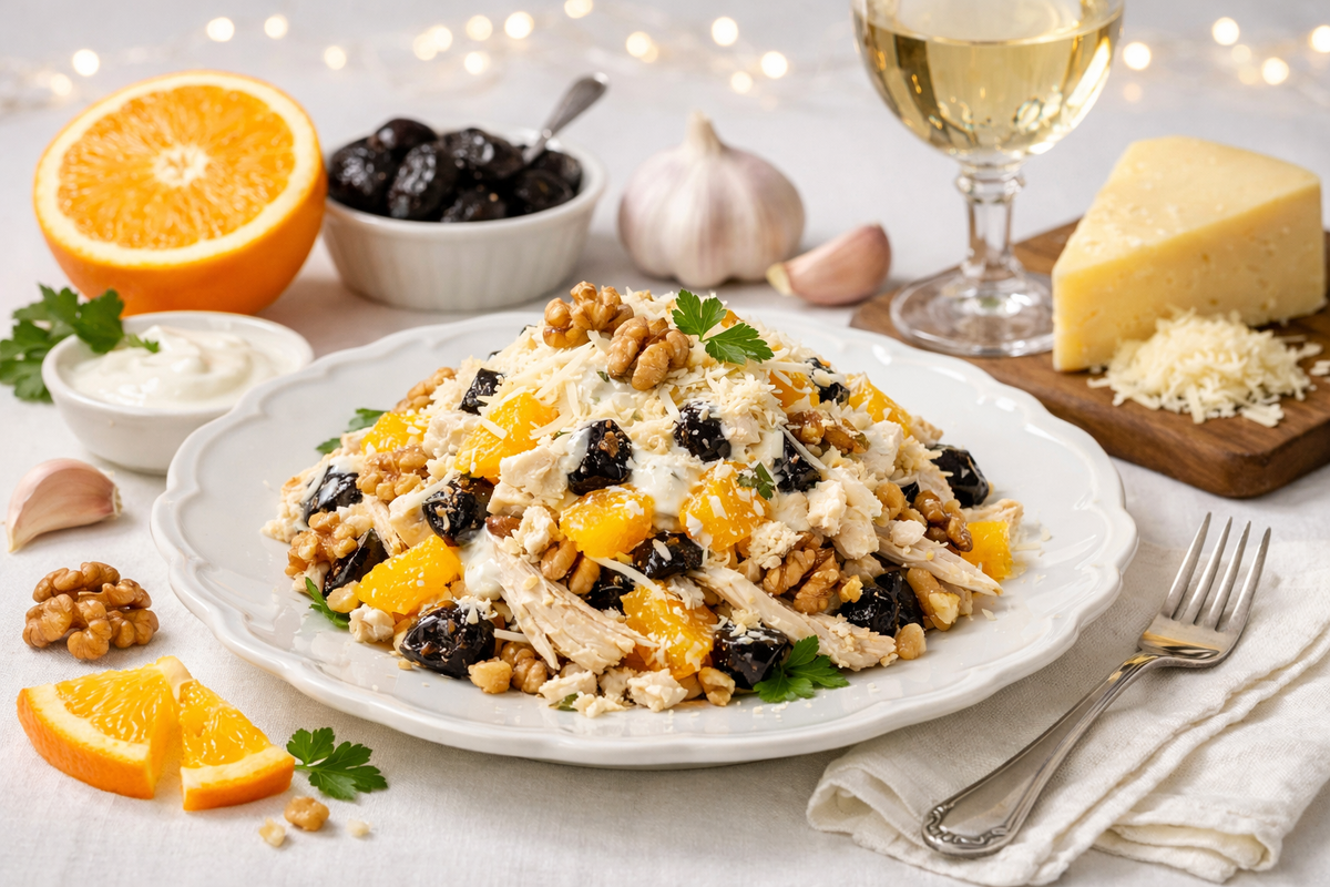 Есть салаты, которые вроде простые, а исчезают со стола первыми. Тут всё держится на контрасте - нежная курица, сладкий чернослив, сочный апельсин, ореховая хрустинка и чуть чеснока, который собирает вкус в одну точку. Заправка на йогурте делает его праздничным, но без тяжести.