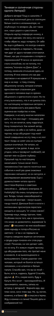 Доброго вечераПишу в самолёте. У меня еще солнечный день со слепящим белым снегом в иллюминаторе, но опубликую-то вечером. Да, вот такие они, наши дороги и расстояния. Открыла наугад очередную книжку, а там про сделаем, что могу, это магия и чтобы обрести, надо потерять. От себя бы еще я добавила, что всегда сначала надо потерпеть и пережить. Не знаю, чем друг от друга человек отличаются. Может, как раз отношением к потерям и переживаниям? Я лично со временем стало спокойнее, но не потому, что наконец "познала на Дзене Дзен", а потому, изменила отношение здесь ко многому. И мне именно это как раз чертовски и не нравится! Я пришла как в мир и на мир - к тому спмому общинному началу, которое считала единственным спасением для одинокого человека еще со времен общинного и крепостного строя. Но по итогу выяснилось, что я не сумела стать по-настоящему интересным автором, а моя откровенность все равно была оценена как позёрство и ложь. Наверное, я не могу многим читателям дать то, что они ищут - площадку для того, что им хочется, кому поругаться. Кому похвалиться. Как всякий автор, зациклена на себе и не люблю, даже не терплю, когда обсуждают под моей темой совершенно не эту тему и не этот текст. Когда не хотят или не считают нужным вчитаться. Не читали, но осуждают и так далее. А еще, если угодно, хоть и прозвучит снобски))), не хватает мне на Дзене глубины. Прошлый год по-настоящему захватывали только канал Злого таможенника (там просто понятные мне события и иной раз даже знакомые персонажи мелькали), но он загнулся, и расследования авиакатастроф. Еще с удовольствием читала одного пенстгеоа-бортача о советских самолётах и.... Доброго электрика. И НиХаЧуХу)! Из очень популярных это все. Теперь только новосибирский и московский зоопарк - манул вышел, панда поела). Дамскыя блоги и влоги с миллионами просмотров перестали заходить и насыщать "от слова совсем". Граммар-наци, между прочим, тоже. Особливо после того, как я прочитала, что никак не дозволяется, выражение "в разы". 🤔 пессимист во мне возобновил свою карьеру и попер в Россию из светлого - я так и не перешла на сторону заведомо жареных заголовков и флуда ради показов или слов ради слов)). Понимаю, на чем делают хайп, но не хочу. Я к живым людям прихожу ща обсуждением того, что трогает меня в моменте. А не выхолощенного и вымышленного. Самое дорогое -это человек, который не боится остаться человеком, а не штампом и белым пальто. Спасибо вам, что вы со мной - были, есть и, надеюсь, будете! Спасибо, друзья 🙏 25 я, скорее всего, буду в Калуге. Кто хочет - присоединяйтесь. И принимается, наконец, запись на встречу с автором)). Формата еда, еда плюс кино, кино плюс еда. Не, ну, могем, конечно, и в баню) 🤣 в смысле в термы. Жду в коммах и в личке! Пишите даты и соображения! пи)