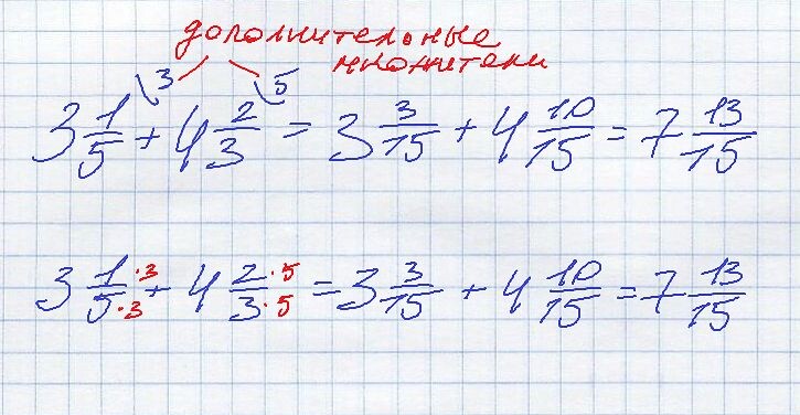Одна из самых важных тем математики - сложение и вычитание дробей с разными знаменателями. Она важна и при решении задач, и уравнений, при усвоении процентов, в общем - важность не оценить. Связь со мной, возможность порешать задания и немного теории в моем ТГ канале. Полные разборы заданий ОГЭ и школьных тем в канале Дзен, где вы сейчас. Математику мы подтянем, а репетиторов по другим предметам вы сможете найти здесь. Поддержка куратора 24/7, все самое основное, без воды, занятия в удобное время. Итек, начинаем... Чтобы сложить две дроби с разными знаменателями, необходимо привести эти дроби к общему знаменателю. Общий знаменатель в примере 1 -15. Чтобы первую дробь привести к знаменателю 15, нужно знаменатель 5 домножить на 3, тогда и числитель 1 домножить на 3 по основному свойству дроби. То же самое делаем и со второй дробью - 3 домножаем на 5, и 2 на 5. Но в школе пишут в "уголках" или в "кармашках" дополнительные множители. Над единичкой я написал дополнительный множитель