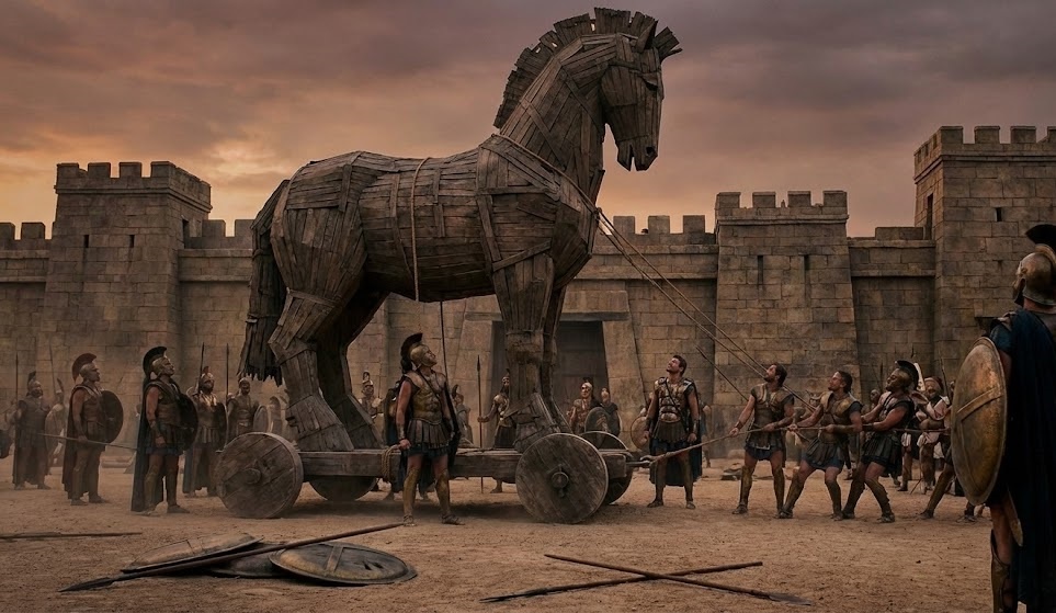 В пантеоне легендарных коней этот персонаж стоит особняком. У него не билось сердце, ему не нужно было сено, и он не переносил всадников через небеса. Но именно этот «мёртвый» конь пролил больше крови, чем все живые боевые кони древности вместе взятые. Троянский конь — это символ смены эпох. Это момент, когда грубая сила (эпоха Ахиллеса и Гектора) уступила место холодному расчету и коварству (эпоха Одиссея). К моменту создания Коня Троянская война длилась уже 10 лет. Это была война на истощение. Нужно было решение, выходящее за рамки военной стратегии. Нужен был «асимметричный ответ». Автором идеи стал хитроумный Одиссей, царь Итаки, который понял: если врага нельзя победить силой, его нужно заставить победить самого себя. Коня построил искусный плотник Эпей (по внушению богини Афины). Это было грандиозное сооружение из пихты или клена. Это был ключевой элемент обмана. Троянцы были глубоко религиозны. Уничтожить дар богине означало навлечь на себя её гнев. Сам по себе деревянный ко