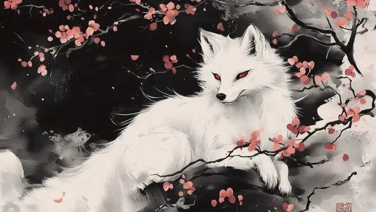 Сначала показалось, что это просто тень или игра света — но нет. Из-за спины лисицы выглядывали не один, а несколько пушистых хвостов, сливавшихся в одно целое. А под глазами, на белоснежной шерсти, виднелись причудливые отметины, похожие на древние символы, написанные розоватой тушью.