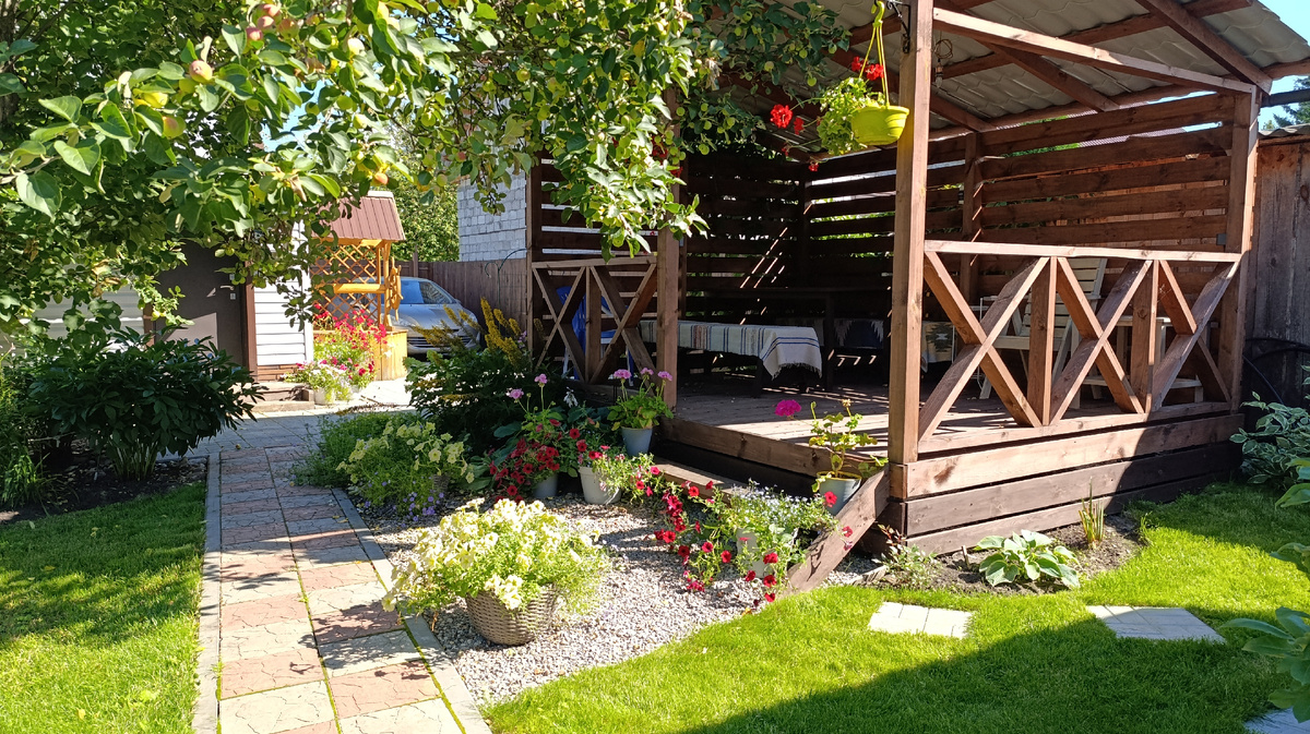 Есть очень хороший приём, уж и не знаю кто это первый придумал: когда собираешься сделать постоянные дорожки, подожди пока их вытопчут люди, а только потом мости. Потому что люди всегда идут оптимальным путём. То же касается и зон отдыха в саду. Прежде чем их делать стационарными, посмотри, где твои гости предпочитают находиться, там и будет правильно поставить скамейку или качели. И наоборот - если скамейкой никто не пользуется, там ли она стоит, где надо? Что касается меня, то в моём саду почти всё сделано неправильно. Беседка Это слишком монументальное строение, а у меня не гектар земли, чтобы её можно было вписать куда угодно. Где уж место нашлось. Да и посиделки в беседке, в основном, когда застолье. Тем не менее, именно она на моём участке расположена практически оптимально. Во-первых, рядом со входом в дом. Это важно - далеко не носить посуду, еду, напитки. По идее, самая лучшая беседка - это открытая веранда. Но у меня не было возможности пристроить такую к дому. Во-вторых, бес