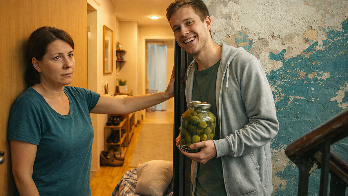 Сергей стоял на пороге моей квартиры, широко улыбаясь, и занимал собой, казалось, всё пространство лестничной клетки. У его ног громоздилась огромная клетчатая сумка, из которой торчал угол подушки, а в руках он держал трёхлитровую банку с чем-то мутно-зелёным.