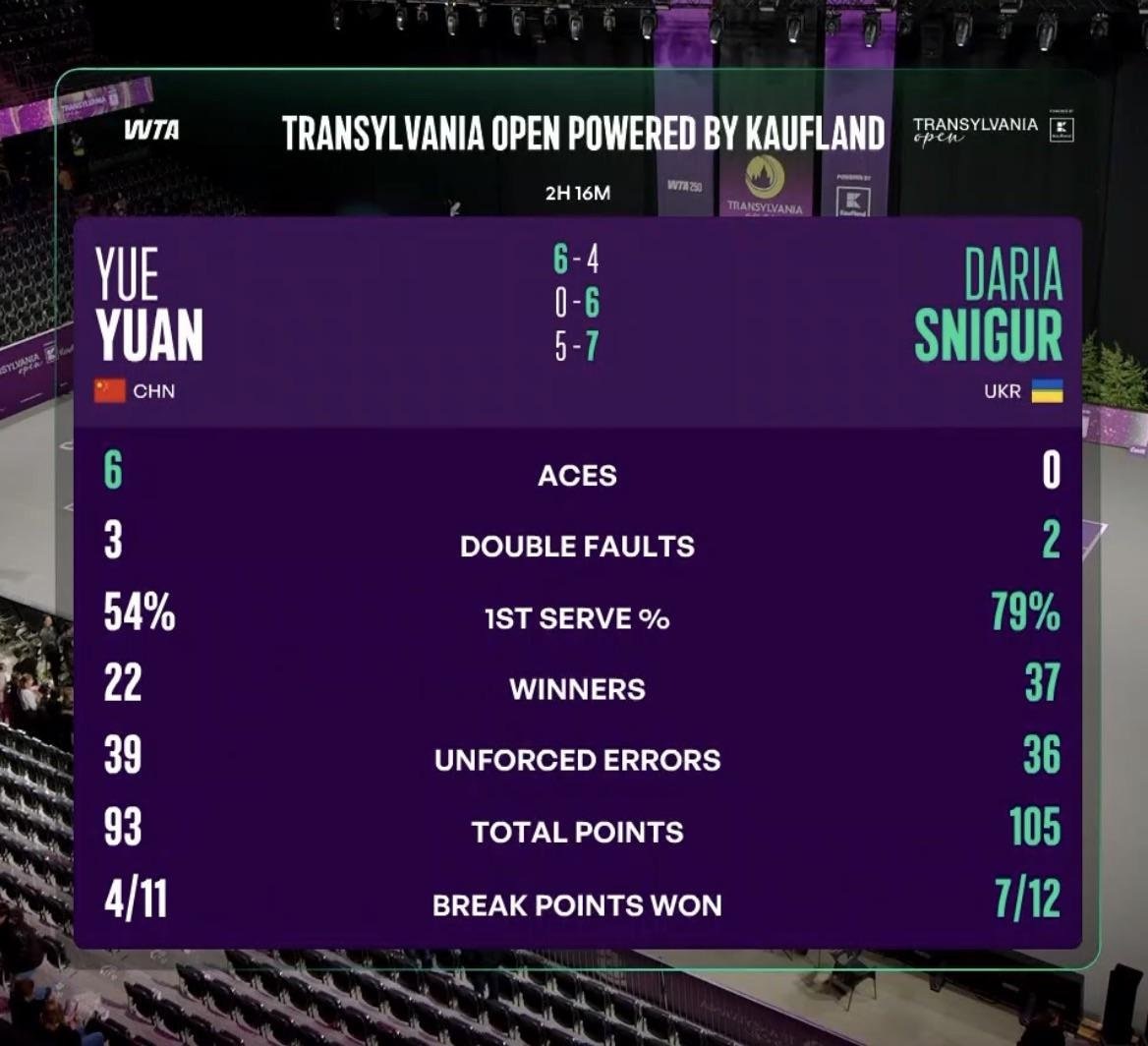 Дарья Снигур победила Юань Юэ со счетом 4-6, 6-0, 7-5.