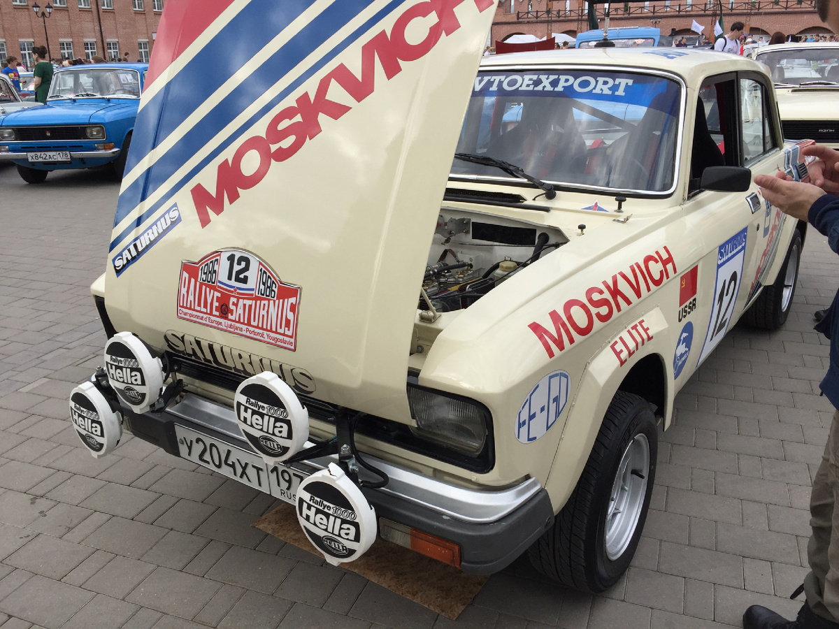 Изучал фотографии в своих архивах и нашёл фотографии с автомобильной выставки в Туле, где я, из толпы стоковых машин выцепил этого светлого красавца, с каркасом, расширителями и открытым капотом, под которым красовались сдвоенные карбюраторы Вебер. Но я даже не подозревал сколько там внесено изменений, по сравнению со обычной машиной. На одной из фото, мой бывший, жёлтый 2140. Абсолютно серийный, хотя и обклеен на мотив гоночных автомобилей тех лет. Но даже он, совершенной обычный, без доработок дарил отличные эмоции и на асфальтовом кольце и на грунтовых трассах. А настоящий гоночный Москвич был усилен. Во всех местах! Усиливали штампованный рычаги передней подвески, обваривая их с разных сторон. Усиливали кузов, продлевая длину лонжеронов по мотивам каблучка 2715. Усиливали заднюю подвеску. И не просто, а так, чтобы мост не двигался в сторону даже на миллиметр! Для этого, делали за мостом хитрый механизм Уатта, в виде рычагов в форме параллелограмма, которые наделяли москвич невероят