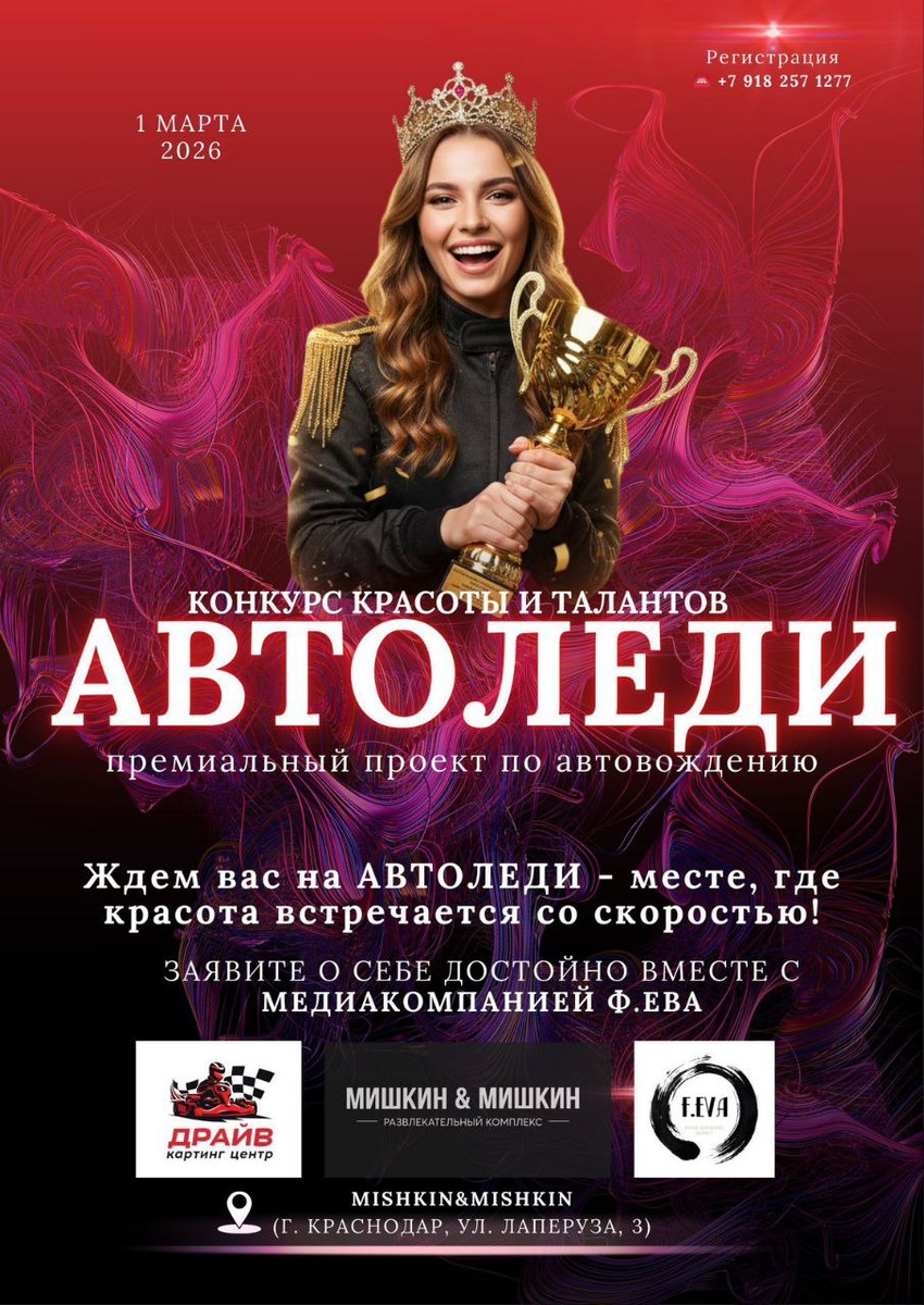 (г. Краснодар, ул. Лаперуза, 3) состоится премиальный конкурс красоты и талантов «Автоледи» - уникальный проект по автовождению для девушек и женщин с категорией В. ‼️В программе: экзамен ПДД, скоростной картинг, парковка и маневрирование, творческие номера и торжественное награждение на сцене. Конкурс «Автоледи» создан, чтобы: - повысить уверенность женщин за рулем; - раскрыть индивидуальность, харизму и таланты участниц; - показать, что вождение может быть стильным и профессиональным; - дарить новый опыт, яркие эмоции и чувство признания. ✔️Проект собирает уникальную аудиторию: бизнес-леди и предпринимательниц, экспертов моды, красоты и стиля, активных и уверенных женщин, которые ценят качество жизни, развитие и новые впечатления. «Автоледи» - это про уверенность, стиль и удовольствие быть собой. Заявите о себе красиво. Количество мест ограничено. Регистрация и подробности: +7 918 257-12-77