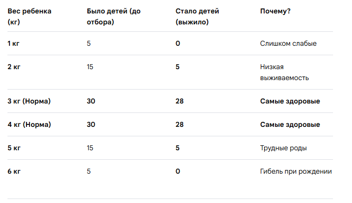 - Кого убирает: Мутантов, «крайние» формы (слишком маленьких или слишком больших).